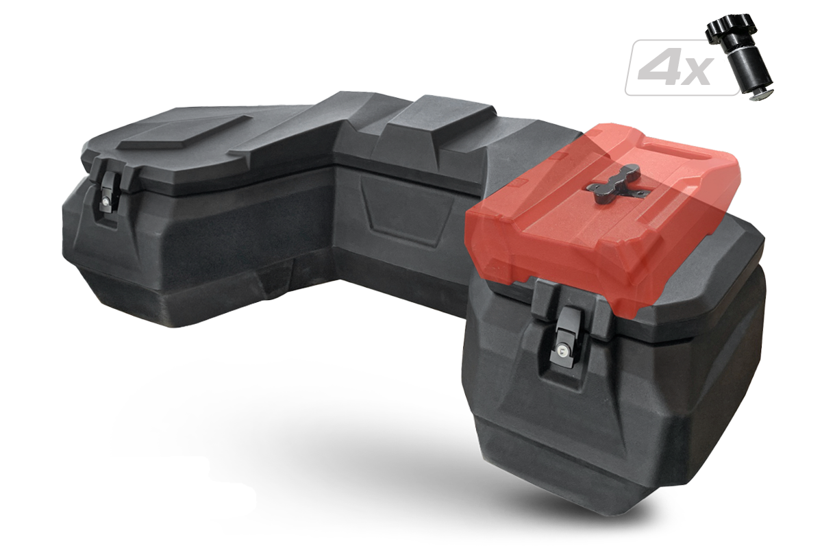 Prostorný zadní box na čtyřkolku, objem 112 litrů, zamykání na dvě kovové přezky, těsnění proti vnikání vody, dvě zadní odrazky, rychloupínací sada součástí balení, rozměry 128 x 58 x 38 cm (D x Š x V), bez kanystru vyobrazeného na fotografii