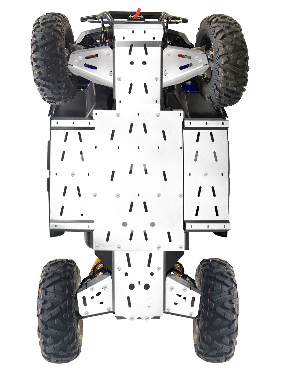 Kompletní kryty podvozku Shark Accessories, ochrana podvozku a spodní části stroje, z odolného anodizovaného a lehkého 4 mm hliníku letecké kvality, montážní otvory pro snadnou údržbu, výřezy pro snadné čištění, nízká hmotnost, snadná montáž