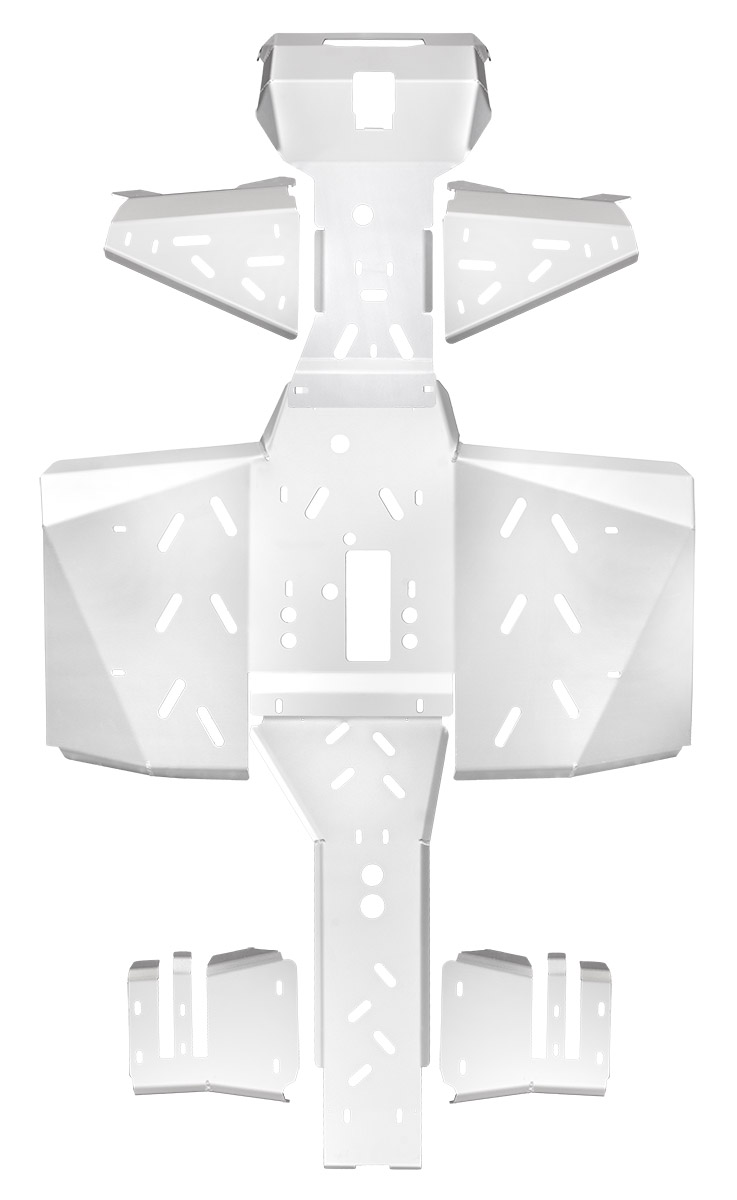 Kompletní kryty podvozku Shark Accessories, odolná ochrana spodní části čtyřkolky, z anodizovaného a lehkého 4 mm hliníku letecké kvality, montážní otvory pro snadnou údržbu, výřezy pro snadnější čištění čtyřkolky, včetně integrovaných krytů nášlapů, nízká hmotnost, snadná montáž